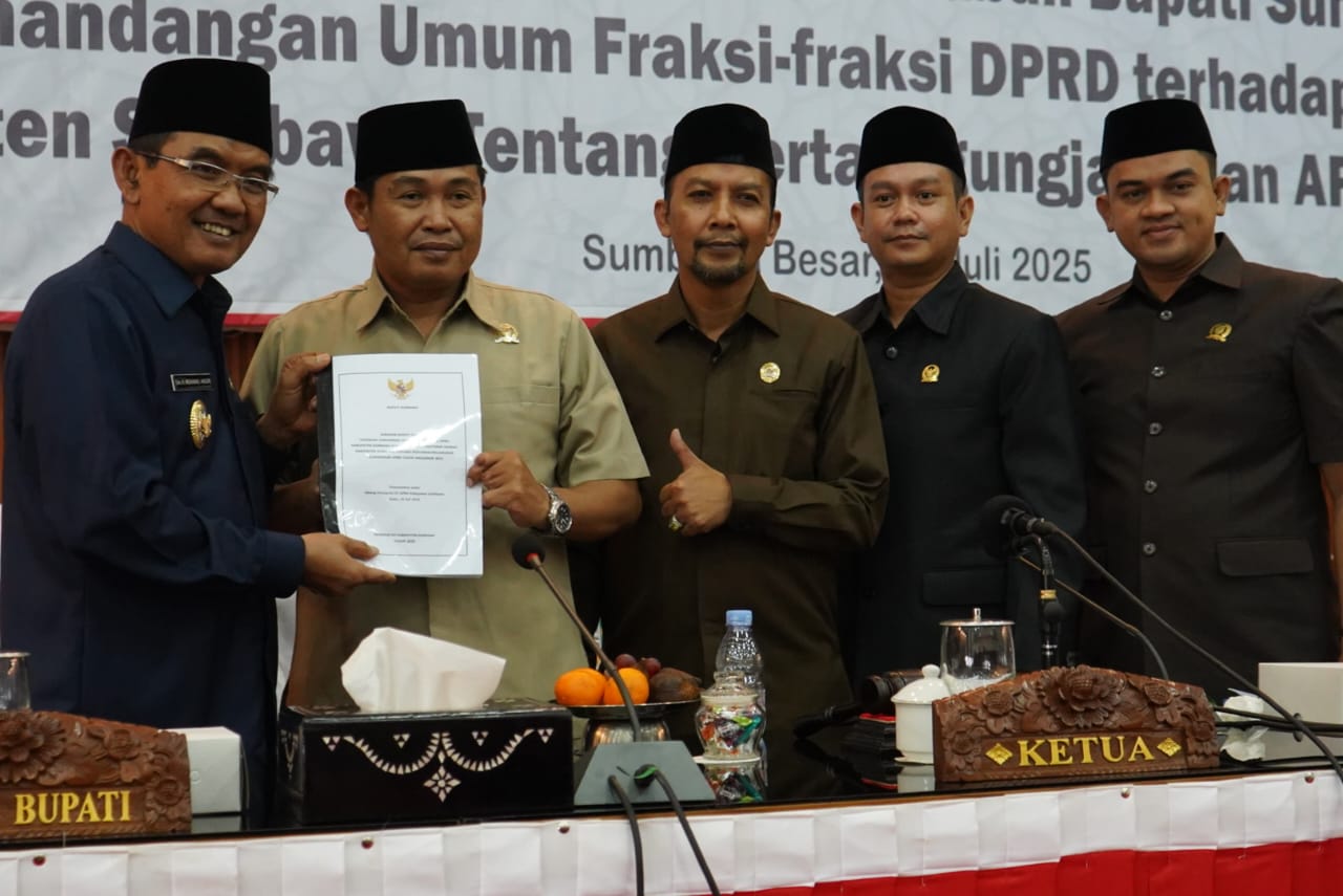 Sumbawa, rumahinformasisamawa Juli kargabet 2025 – Wakil Bupati Sumbawa, Drs. H. Mohamad Ansori, ikuti Rapat Paripurna Jawaban Bupati Sumbawa Terhadap Pandangan Umum Fraksi-Fraksi DPRD Kabupaten Sumbawa Atas Rancangan Peraturan Daerah Kabupaten Sumbawa Tentang Pertanggungjawaban Pelaksanaan APBD Tahun Anggaran 2024. Rapat ini berlangsung di ruang rapat Paripurna DPRD Kabupaten Sumbawa, Rabu, (16/7/2025). Hadir juga Forkopimda Kabupaten Sumbawa, sejumlah OPD, serta para anggota DPRD Kabupaten Sumbawa.Menjawab Pandangan Umum Umum Fraksi-Fraksi DPRD Kabupaten Sumbawa, Wakil Bupati Sumbawa menyampaikan, terkait dengan realisasi Pendapatan Asli Daerah (PAD) yang melampaui target, yang masih didominasi oleh pajak daerah dan retribusi daerah. target maupun realisasi tahun 2024 lebih tinggi dari tahun-tahun sebelumnya. Pemda berkomitmen untuk terus melakukan terobosan-terobosan agar target optimis peningkatan PAD yang ditetapkan dalam RPJMD tahun 2025-2029 dapat tercapai, Ujarnya.Wabup juga menyampaikan, kontribusi BUMD terhadap PAD belum maksimal. Sehingga, Peran BUMD akan terus tingkatkan agar lebih relevan dengan dinamika potensi daerah, termasuk kemungkinan pengembangan unit usaha baru di sektor air minum, pangan lokal, serta jasa keuangan mikro yang bersentuhan langsung dengan pelaku ekonomi rakyat, Jelasnya.Pemkab Sumbawa, sambung wabup, juga mengupayakan untuk mewujudkan pembangunan, rehabilitasi dan pemerataan infrastruktur-infrastruktur di Kabupaten Sumbawa terutama infrastruktur jalan. Ini menjadi prioritas Pemerintah Kabupaten Sumbawa yang tercantum dalam 45 program prioritas dalam RPJMD Tahun 2025-2029. Selain itu, Pemkab Sumbawa, akan memprioritaskan proyek-proyek strategis yang memiliki multiplier effect terhadap sektor riil, seperti pasar rakyat, irigasi pertanian, dan infrastruktur penunjang kawasan produktif masyarakat, Tambahnya.Lebih lanjut, wabup menyampaikan, Pemkab Sumbawa akan terus meningkatkan pencapaian kinerja tata kelola keuangan daerah, pelayanan umum pemerintahan, dan pelayanan dasar. Salah satu upaya positif untuk pencapaiannya adalah opini Wajar Tanpa Pengecualian (WTP) dari BPK RI atas LKPD Tahun Anggaran 2024. Keberhasilan ini, harus terus menjadi motivasi penguatan akuntabilitas dan transparansi dalam pengelolaan keuangan daerah, Tegasnya.